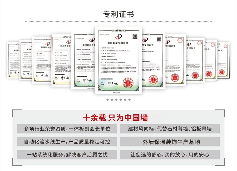 寶潤達在保溫裝飾一體板領(lǐng)域的優(yōu)勢,不僅僅只是建立在現(xiàn)代化的生產(chǎn)車間、先進的制造工藝、卓越的產(chǎn)品性能上。寶潤達自1995年涉足外墻裝飾領(lǐng)域以來,積累了24年的行業(yè)經(jīng)驗,擁有一支行業(yè)高水準的設(shè)計、安裝施工隊伍,真正具備集產(chǎn)品、設(shè)計、施工為一體,打造精品工程的能力。只要您給寶潤達參與的機會,我們就有十足的信心向您提供放心的系統(tǒng)化解決方案。